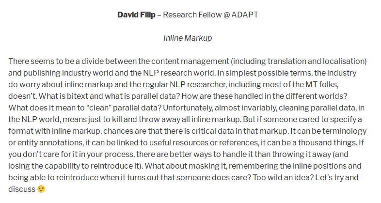 #Interoperability &#Standardization of#KnowledgeBases as part of our Workshop, with the short title "Inline Markup"@merzbauer#NLPro@insight_centre@AdaptCentre@fbk_mt@MTSummitXVII#XLIFF -