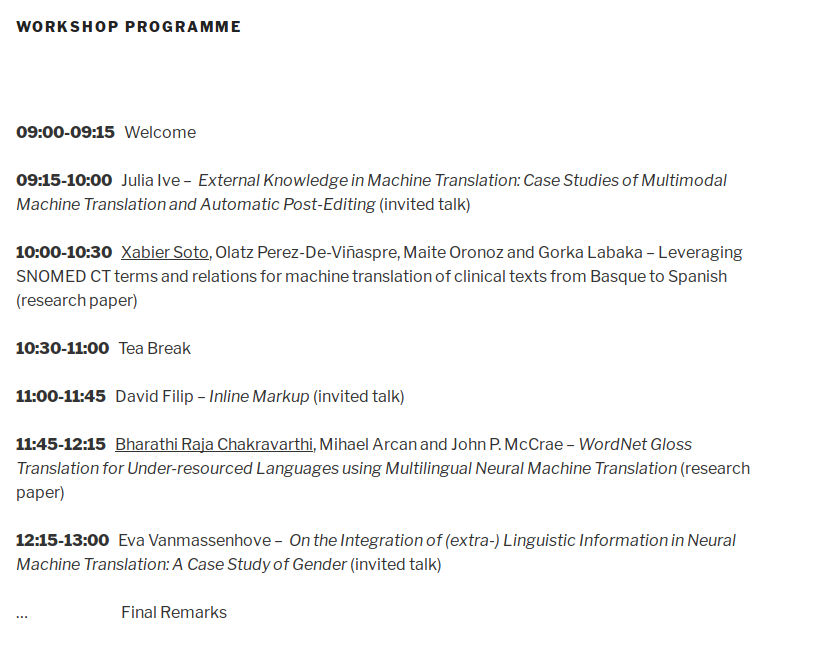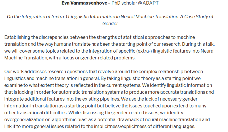 Our final invited talk will be given by Eva Vanmassenhove on "On the Integration of (extra-) Linguistic Information in Neural Machine Translation: A Case Study of Gender"