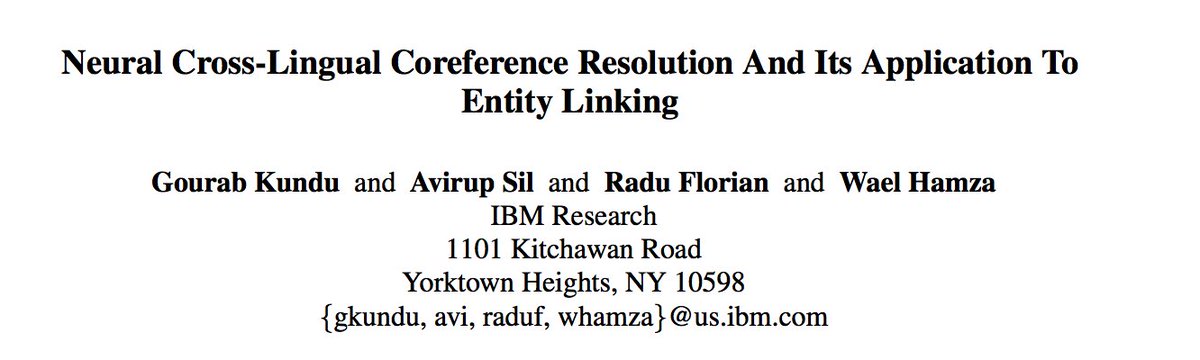 Come see our paper "Neural Cross-lingual Coref resolution and it's application to Entity Linking" tomorrow at 2pm in ROOM 210/211, MCEC. SOTA Results on coref and entity linking!