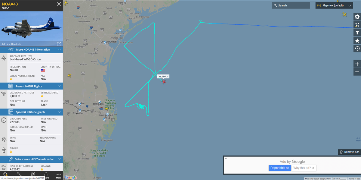 #NOAA43 ‘Miss Piggy’ performing some low altitude observations of#Hanna over the Gulf of Mexico. https://www.flightradar24.com/NOAA43/2507589d pic.twitter.com/GMZ0G3Blj8