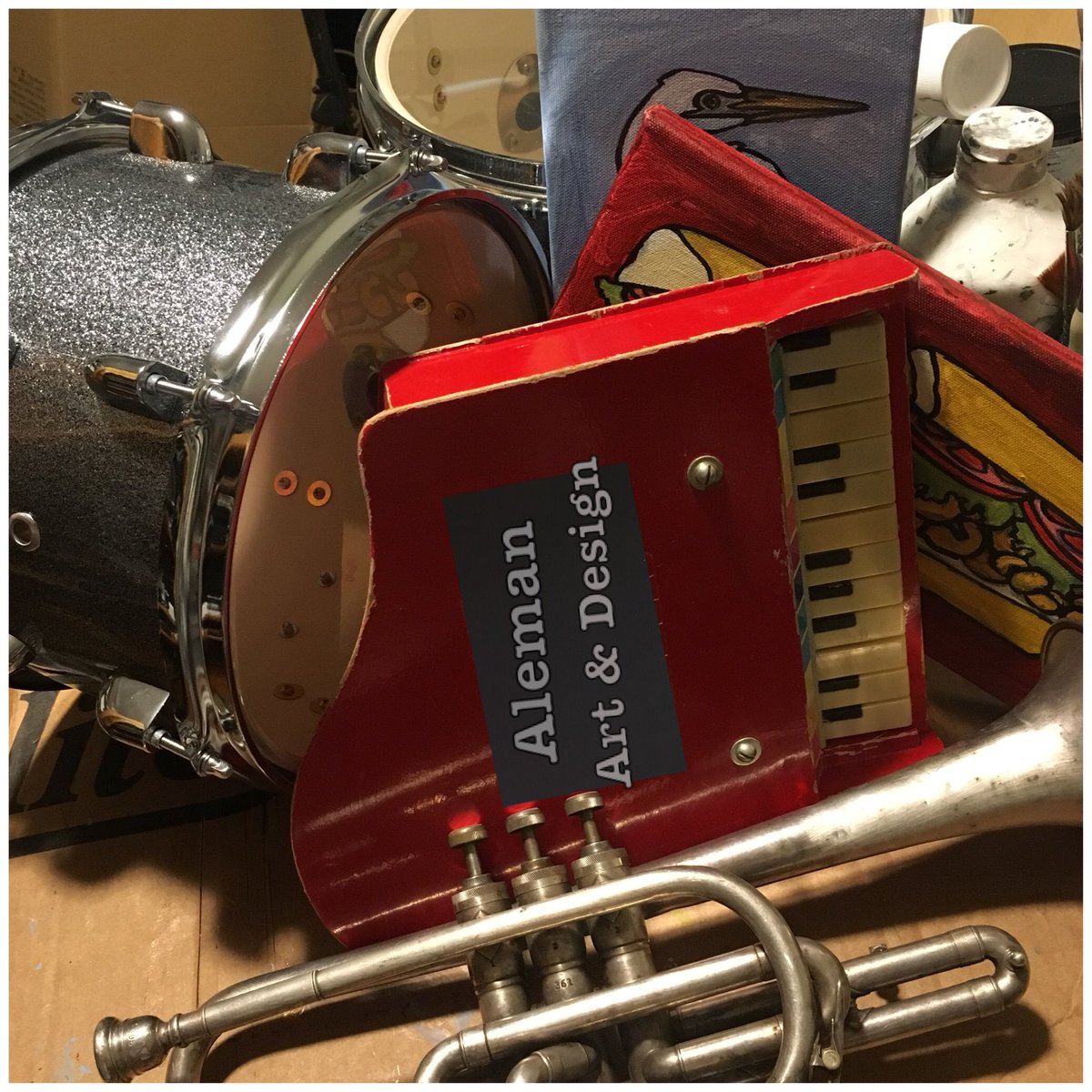 Getting in lots of new things like drums, trumpets, toy pianos, game boards & music instrument cases for more mixed media paintings for upcoming fall markets.