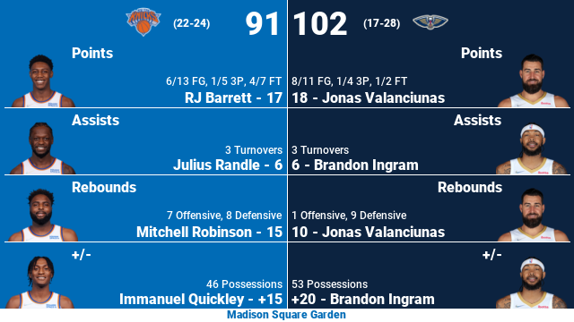 The New Orleans Pelicans defeat the New York Knicks 102-91 off of 18 points from Jonas Valanciunas.