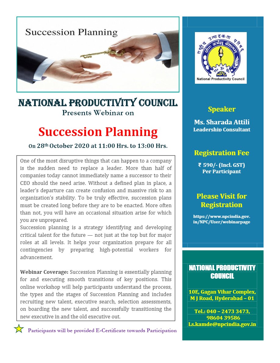 NPC India Presents Webinar on Succession Planning on 28th October 2020 at 11:00 am to 1:00 pm Fee:590/- per Participant Register Now: https://www.npcindia.gov.in/NPC/User/webinar_registration?course_select_id=NTM5 …