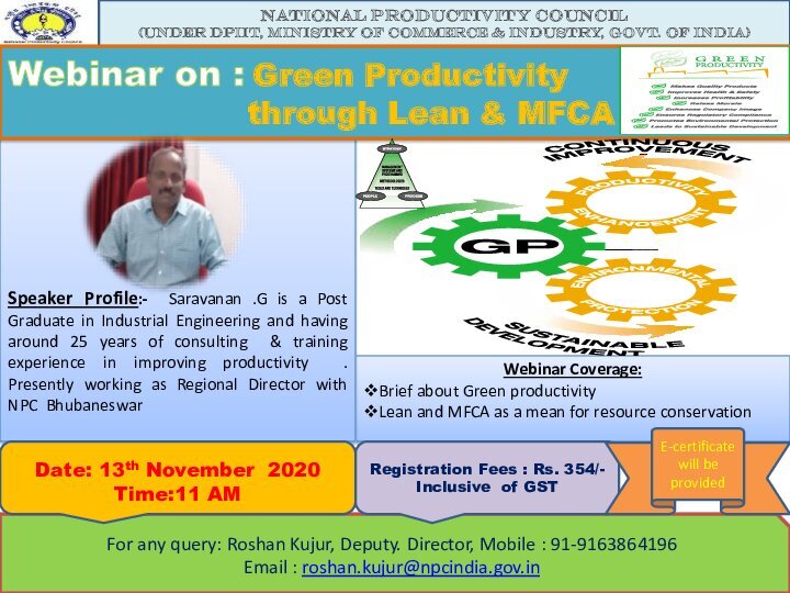 Webinar on "Green Productivity through Lean & MFCA" Register Now:-https://www.npcindia.gov.in/NPC/User/webinar_registration?course_select_id=NjIz … Contact:- 91-9163864196 Email : roshan.kujur@npcindia.gov.in Date: 13th November 2020 Time:11 AM Registration Fees : Rs. 354/- Inclusive of GST