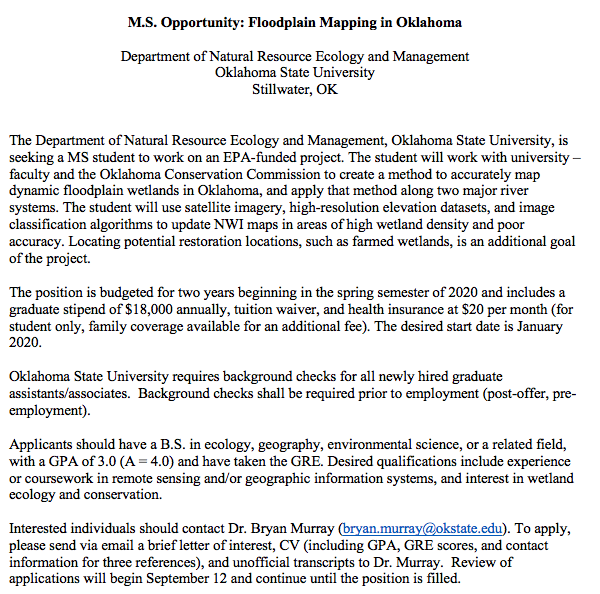 #NREM#okstate to pursue an MS in#GIS#Ecology with new faculty member, Dr. Bryan Murray. Bryan rules! I'll be on your committee (if you like). Looking for a January 2019 start date. APPLY!pic.twitter.com/Au2ZglYMVs
