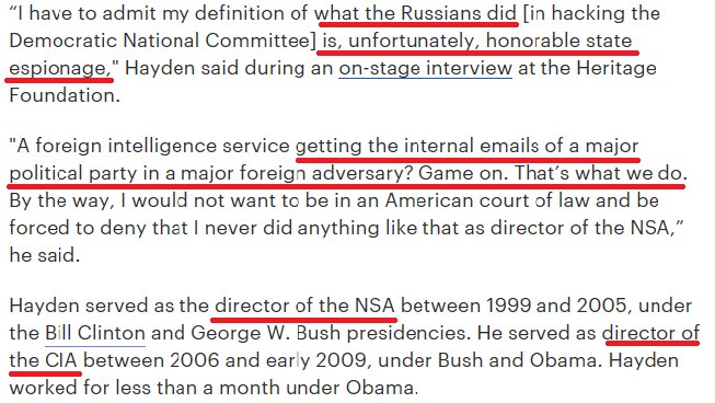 #NSA and the@CIA, Michael Hayden on honorable state espionage and "what we do" in cyberwarfare. http://thehill.com/policy/cybersecurity/301667-former-cia-and-nsa-head-suggests-us-also-hacks-political-parties …pic.twitter.com/VXtFAPBfFk