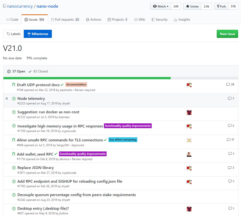 #Nano#development in action? Take a look at the v21 milestone on GitHub!#opensource#cryptocurrency https://github.com/nanocurrency/nano-node/milestone/18 …pic.twitter.com/KggMeAuwdu