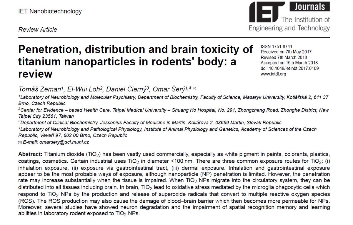 #Toxicita a prostup nanočástic titanu do těla?#Nanočástice mohou po prostupu do mozku ovlivňovat#paměť a učení. Nanočástice titanu jsou ve velkém vyráběny pro kosmetiku, stavební průmysl, barviva. Vyšel nám článek v britském časopisu#IET#Nanobiotechnology@IET_Journalspic.twitter.com/pfYaZXX9TY