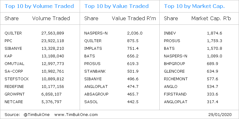 #JSE Trading Stats - 29/01/2020 -#Quilter#Naspers#AnheuserBuschInBev#PPC#PROSUSpic.twitter.com/xgA8FoM5K4