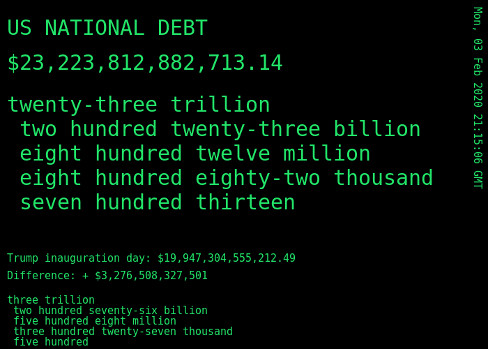 Verified account@NationalDebt Follow the national debt. (+) or (-) means up or down from previous day's debt total. Brought to you by the Peter G. Peterson Foundation (