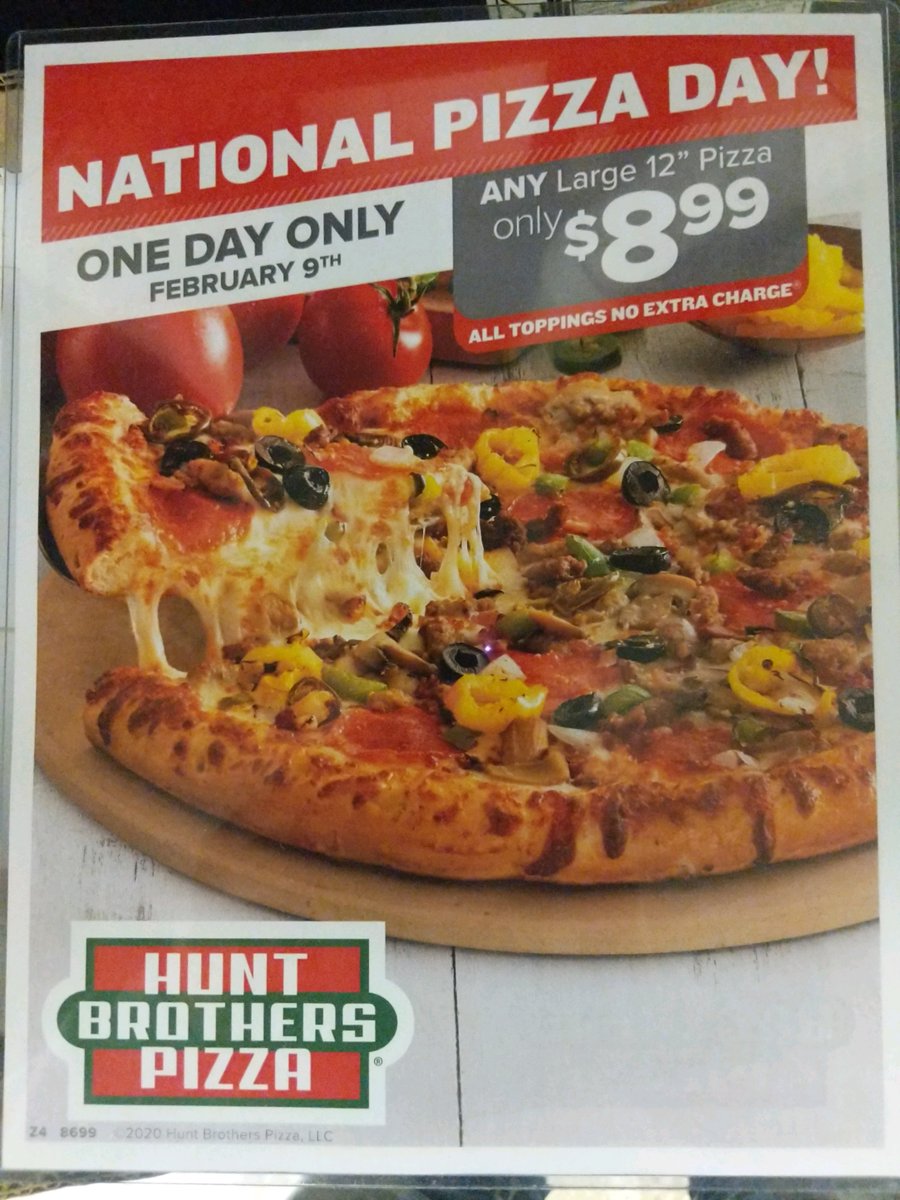 #NationalPizzaDay with any large 12" pizza only $8.99 (all toppings no extra charge). One day only!! pic.twitter.com/ocxWMigOb2