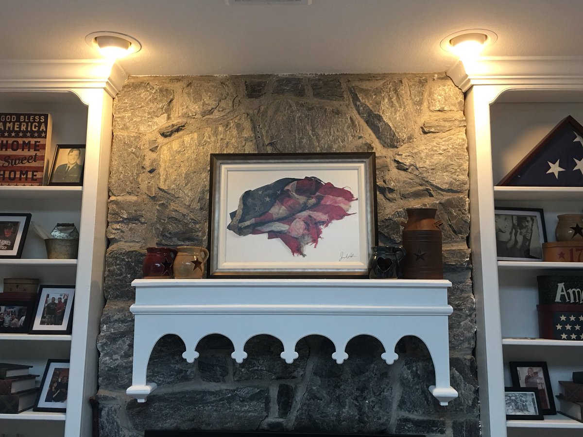 This piece on our mantle is of the lone Flag from Ground Zero. The original hangs in the museum! “Our Flag Was Still There” was taking when the photographer was photographing artifacts from 9/11 when the burned flag was found. I had to purchase to remind us daily