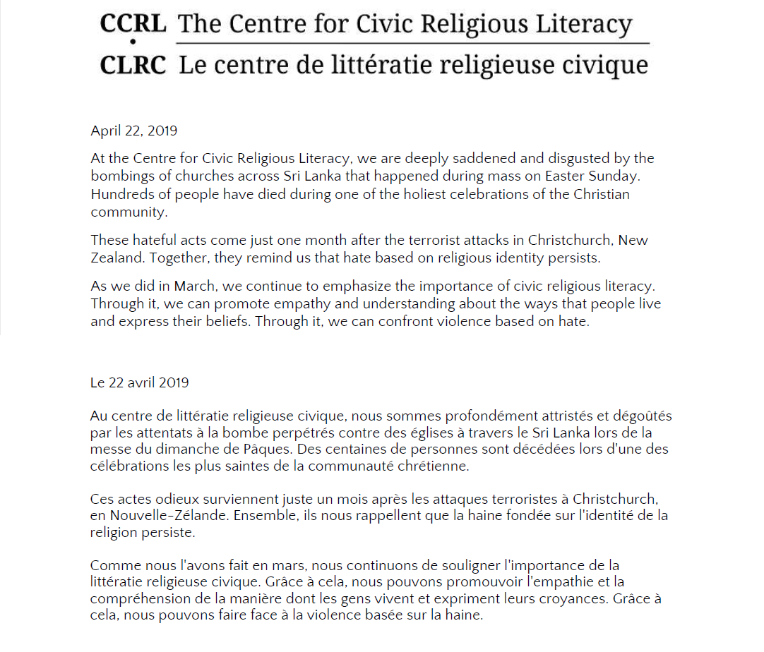 #SriLankaBombings just one month after#NewZealandTerroristAttack - both are heartbreaking. Details on the bombings still emerge, but one thing is clear - hatred is causing death. At CCRL, we stand against this hate & promote civic#religiousliteracy to tackle the roots of hatepic.twitter.com/nBk2XbsWuL