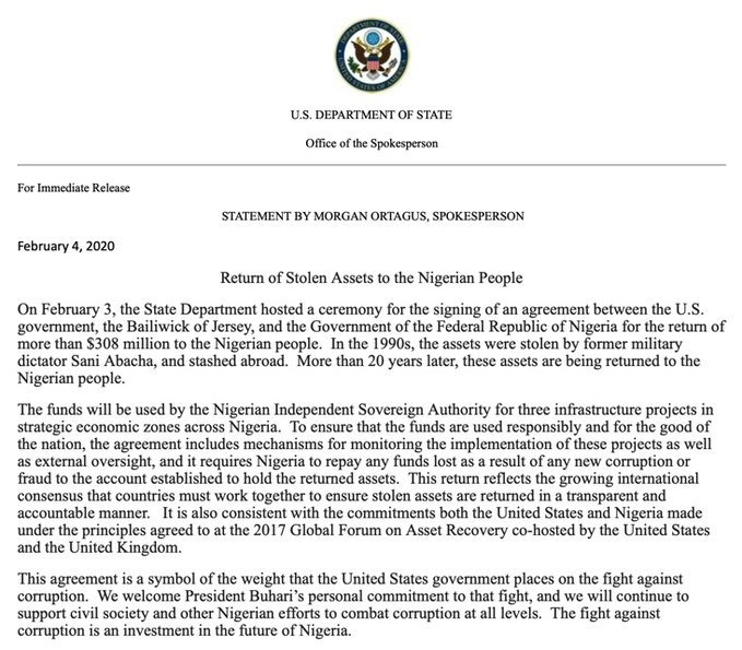 #Nigerian government has signed a tripartite agreement with Government of Jersey and United States of#America on recovery of over $300m looted by the military junta led by late Gen. Sani#Abacha. https://www.independent.ng/nigeria-u-s-sign-agreement-on-repatriation-of-300m-abacha-loot/?utm_source=dlvr.it&utm_medium=twitter … -