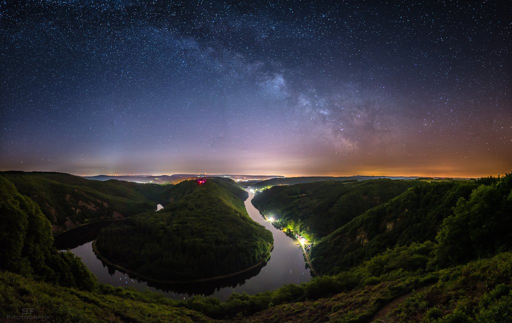 Milky way over Saar loop valley - panorama -