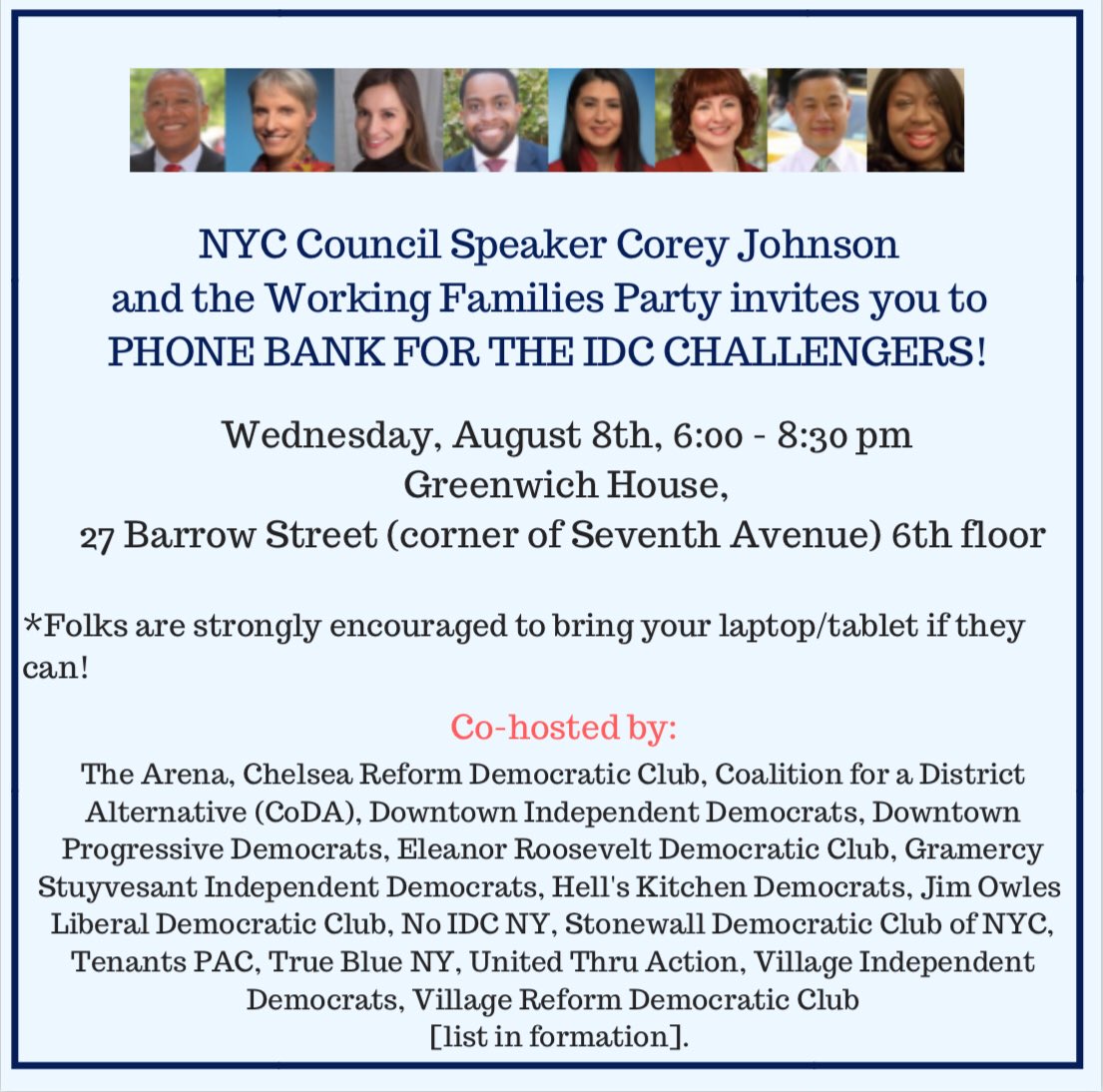 Phone bank for the IDC challengers this Wednesday! 6-8:30pm at 27 Barrow Street.