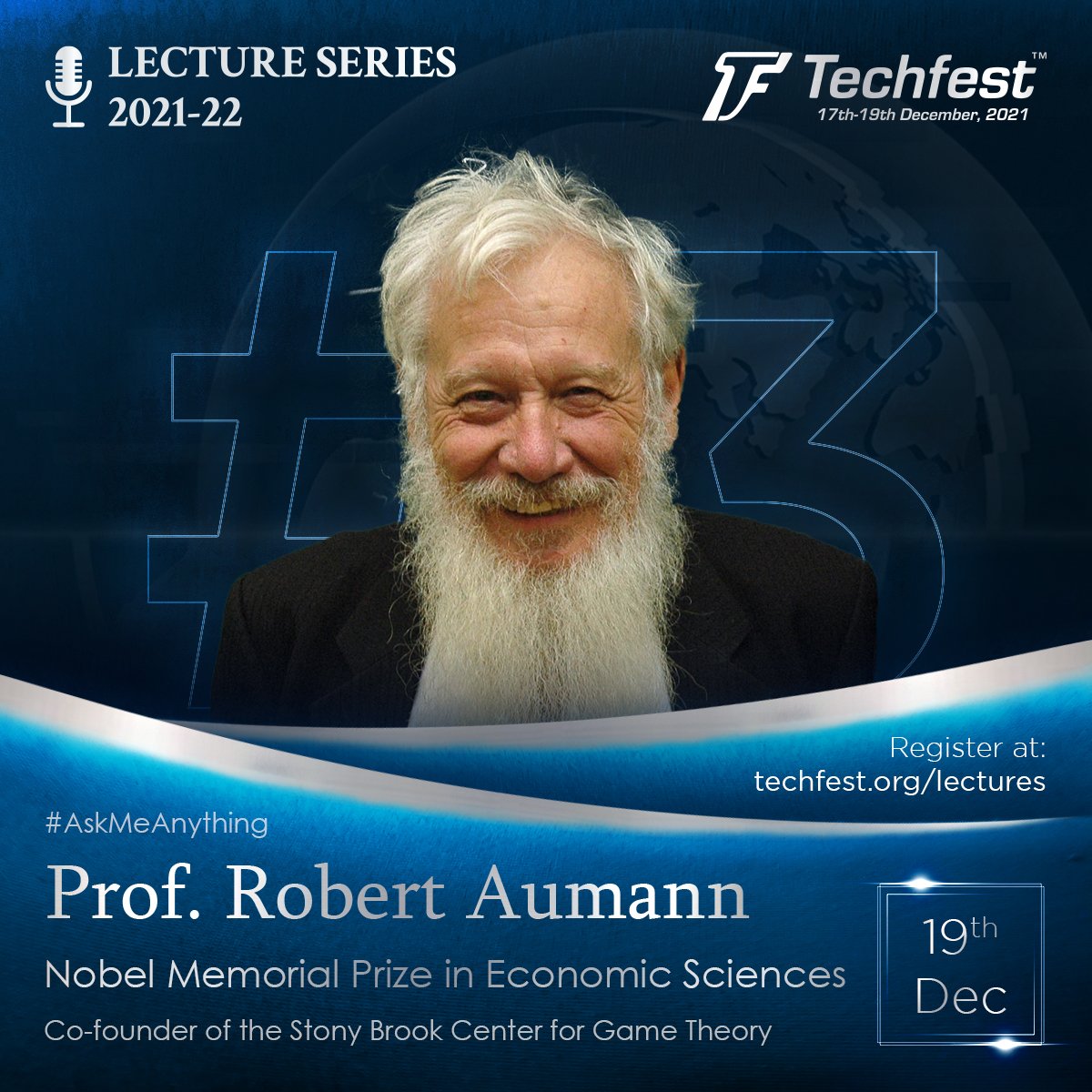 Presenting Prof. Robert Aumann as the next speaker in the Lecture Series! Mark your calendars! 19th December 2021 Topic: Economics and Behavioral Economics Register at http://techfest.org/lectures to receive a reminder!