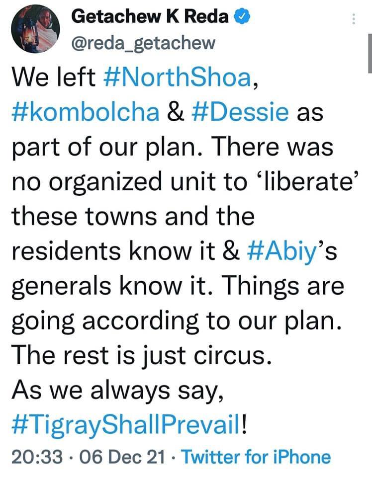 #NorthShoa,#kombolcha &#Dessie as part of our plan. There was no organized unit to ‘liberate’ these towns and the residents know it &#Abiy’s generals know it. Things are going according to our plan. The rest is just circus. As we always say,#TigrayShallPrevail! -