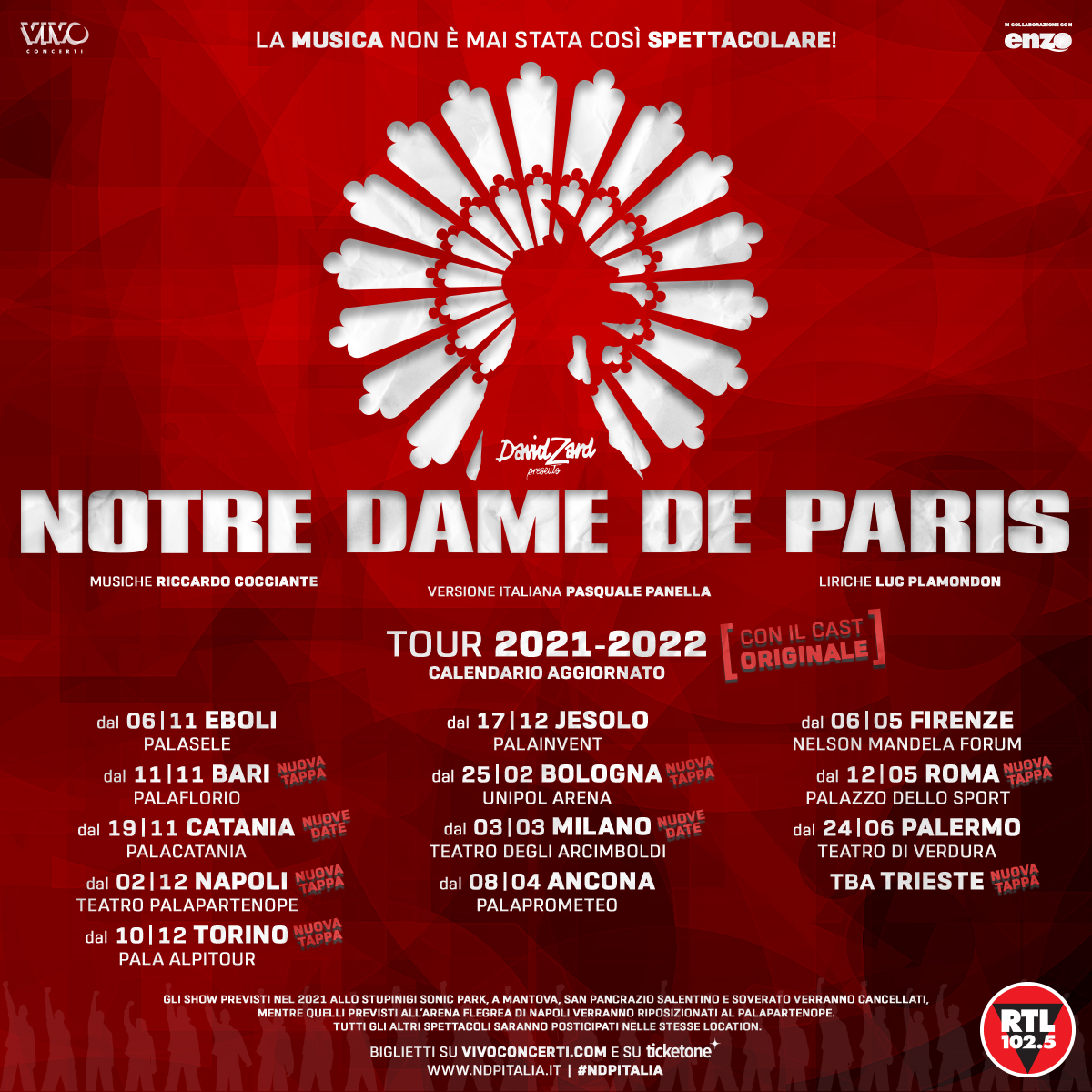 #NotreDamedeParis, la tournée dell’opera popolare più amata di sempre si prepara a tornare in scena e lo fa rinnovando il calendario, a partire dall'autunno 2021 e per tutto il 2022 pic.twitter.com/19dtzHFBSP