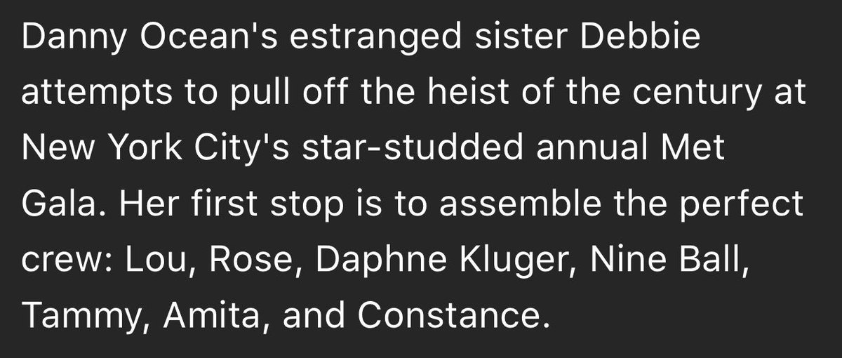 #OceansEight .... mr Ocean's women gang , movie ... :P (Bullock, Blanchett , Hatwey etc. ) pic.twitter.com/3lfi3T9cfv