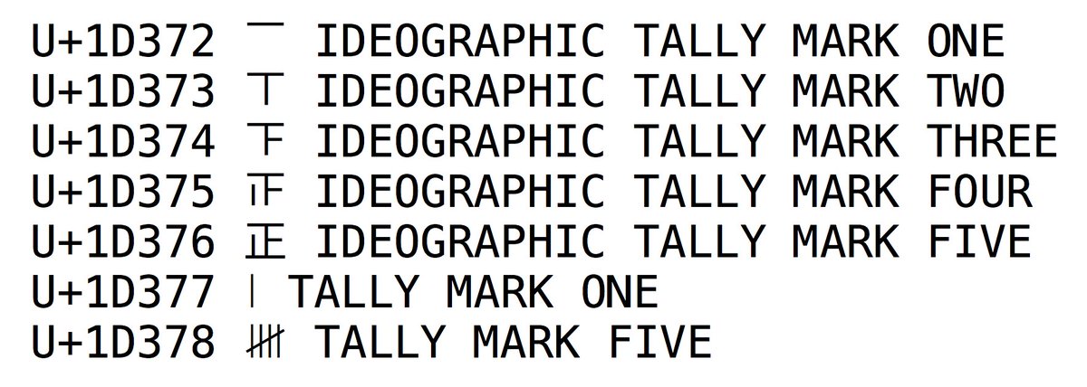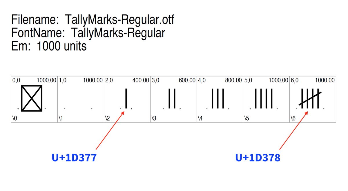 #TallyMark systems that@qvarie & I proposed are now in#Unicode11. The#OpenType font that I created for the Western-style system uses multiple instances of U+1D377 via the ‘ccmp’ GSUB feature to form 2 through 4, and can also be used to form 5 (U+1D378). pic.twitter.com/60LnYG74Nr