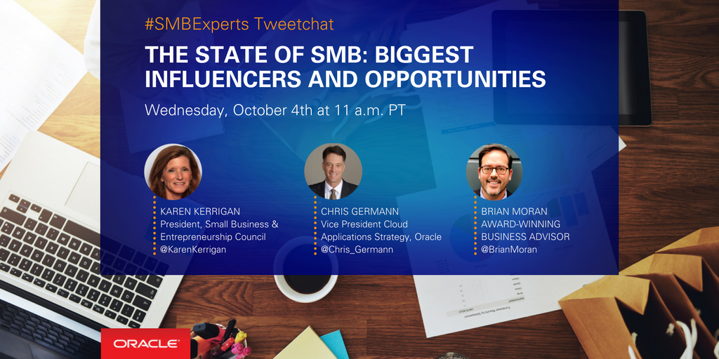 #SMBExperts chat, a smart discussion on the state of SMB at 11 am PT TODAY!#oow17#OracleSMB pic.twitter.com/mRhqCLLckT