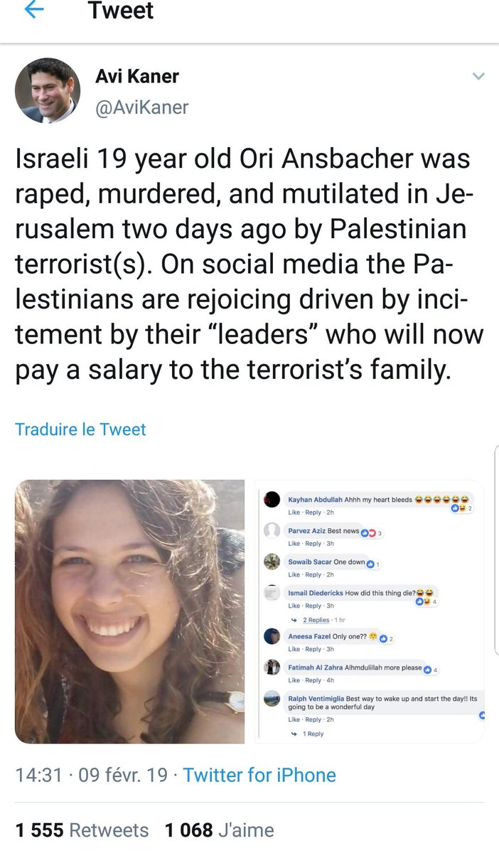 #OriAnsbacher mérite votre bouche cousue ? Ou l assasinat le viol la torture d'une jeune isralienne par des palestiniens n'est pas suffisamment vendeur pr vous ? Je vous laisse voir la réaction de la population palestinienne quand ils apprennent ce meurtre pic.twitter.com/vnWCpUnJKu
