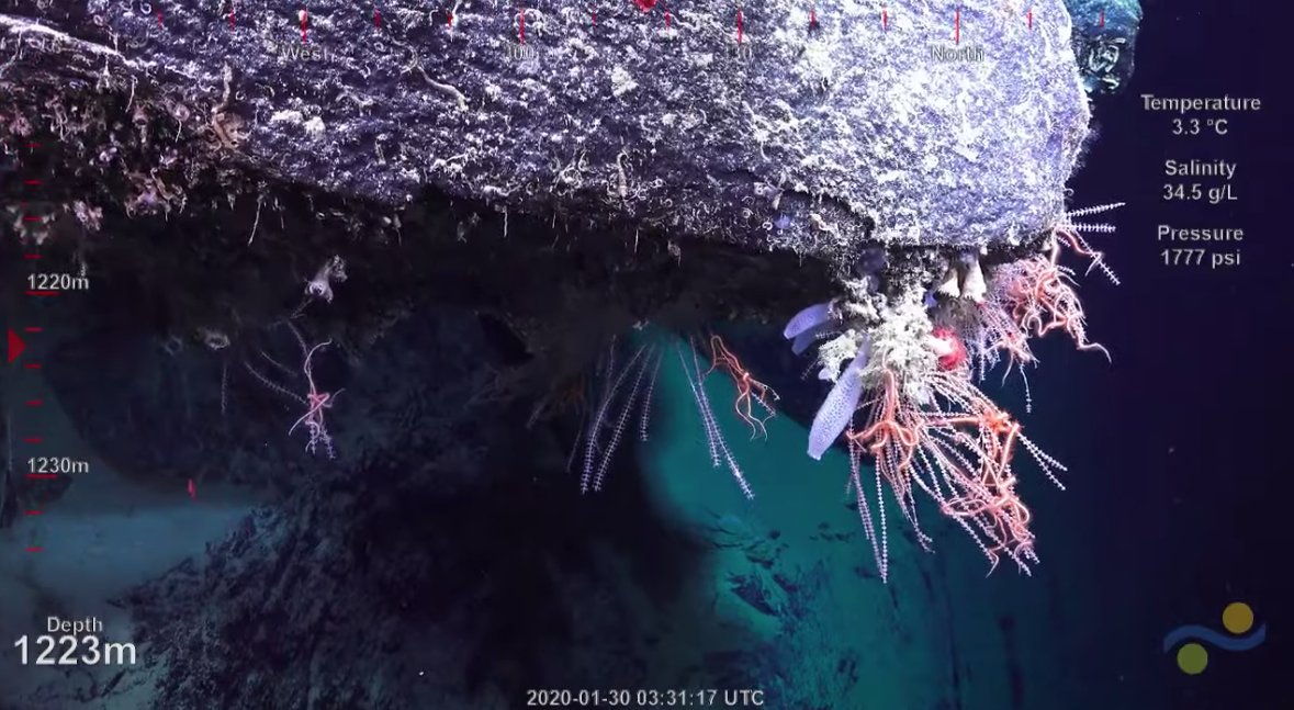 #deepsea imagery showing brachiopods, bivalves,#sponges, and more, densely populating an overhang in#BremerCanyon. Unfortunately, this#DeepCoralAdventure#LiveDive had to be cut short due to weather. Hopefully@SchmidtOcean will be diving again soon!#OzOceans2020 pic.twitter.com/k70Fbq7BNF