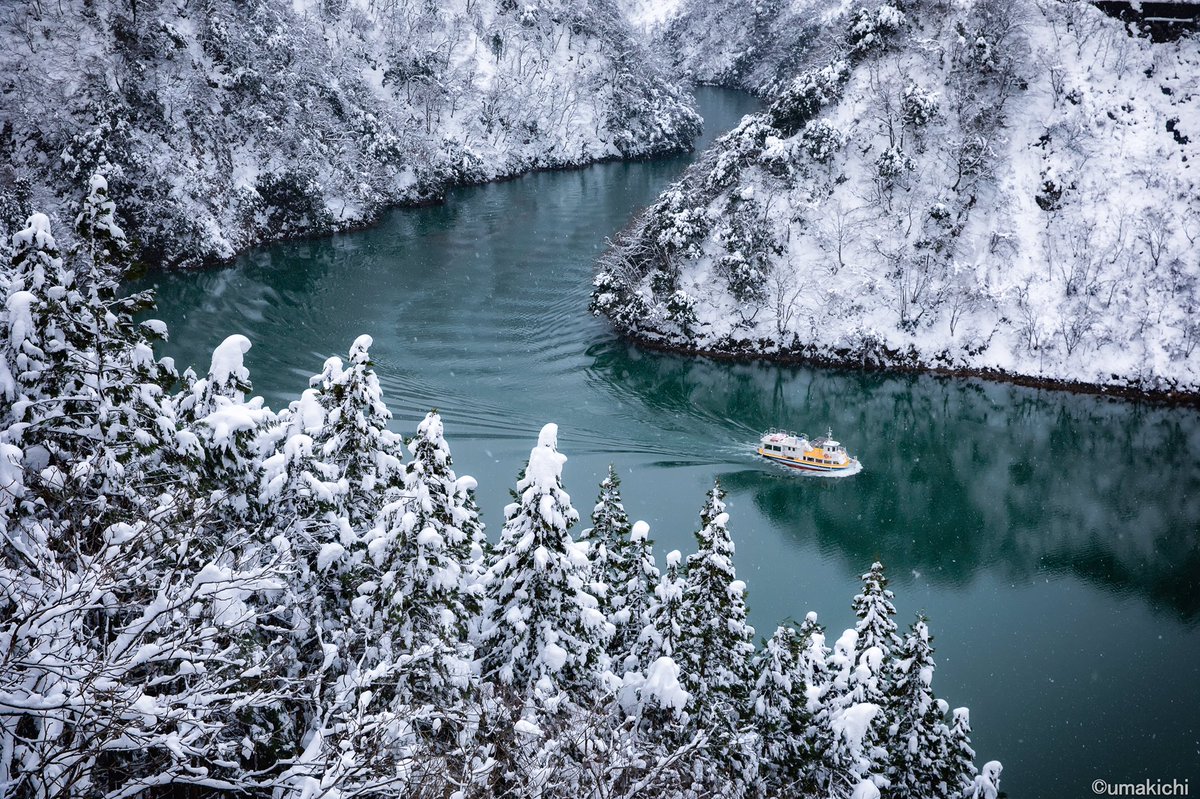 “winter trajectory” 雪化粧した深碧の湖面を行く遊覧船の軌跡が冬の美しさを改めて教えてくれた。