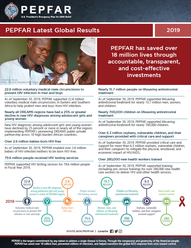 #PEPFAR has prevented millions of infections and helped transform the global AIDS response from crisis toward control. Check out the latest fact sheet to learn more: http://ow.ly/LjAm50y4bn7#PEPFARSavesLives -