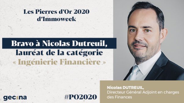 @Gecina remporte la#PO2020 dans la catégorie « Ingénierie Financière », un grand bravo ! >> https://www.immoweek.fr/bureaux/actualite/nicolas-dutreuil-gecina-laureat-pierre-dor-ingenierie-financiere-2020/ …pic.twitter.com/7ESbDf6C1I -