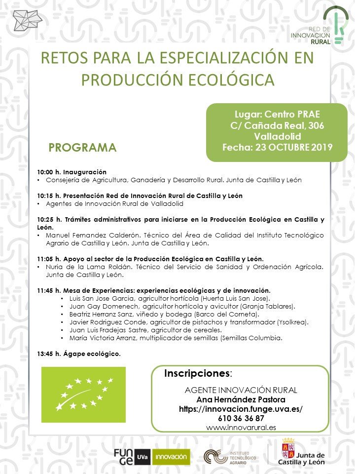 #PRAE de la Agencia de Imnovación Rural de Valladolid, sobre "Retos para la especialización en producción ecológica". A las 11:45 h podremos escuchar a algunos compañeros, en la Mesa de Experiencias. pic.twitter.com/FbjwlyMI6y