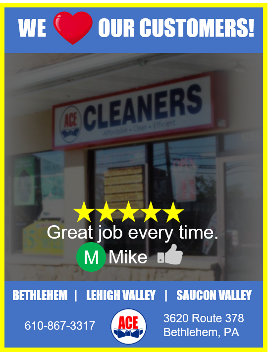 We love our customers and they love our services! Proudly serving the Bethlehem, Lehigh Valley, and Saucon Valley area. 610-867-3317 Go to http://www.acecleanersbethlehem.com for all of your questions or comments.