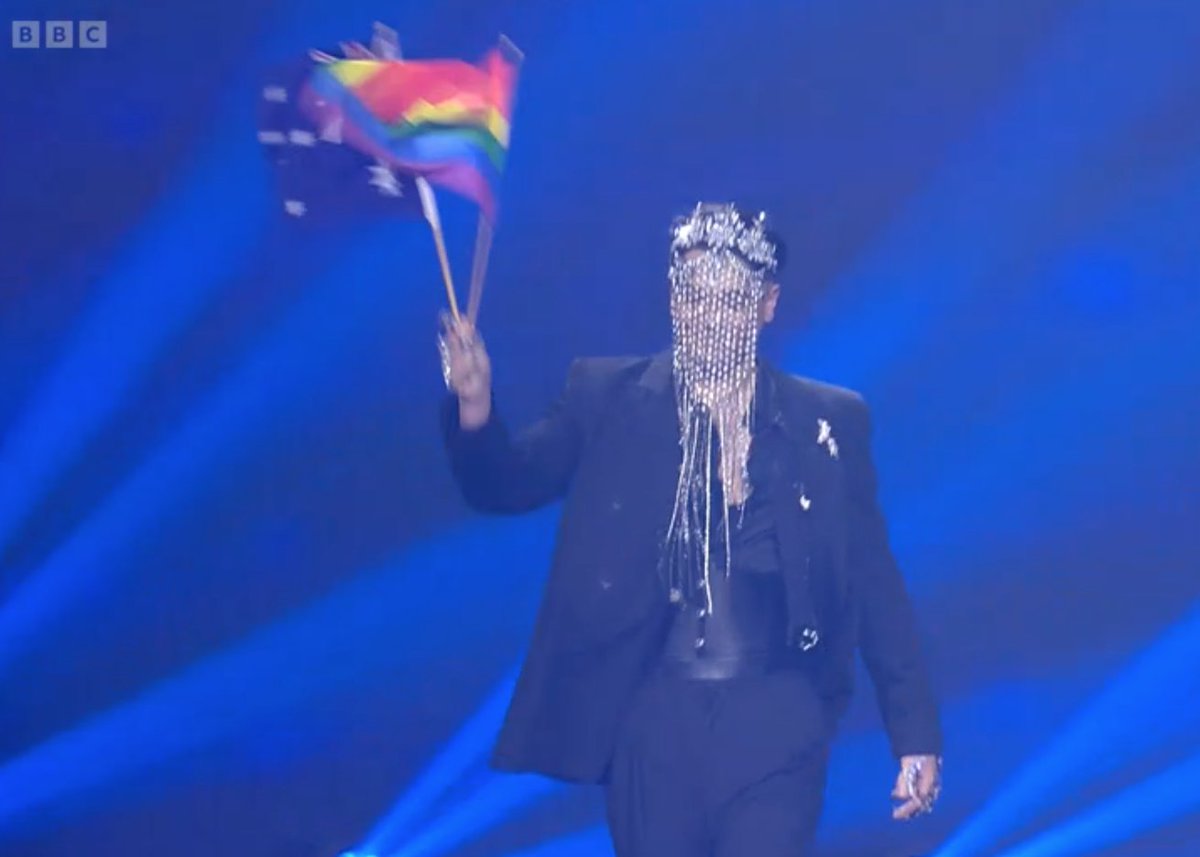 entry @SheldRiley walking on stage waving a#Pride flag. Could this year's contest be the queerest yet? We definitely hope so pic.twitter.com/z06pqq1YG8