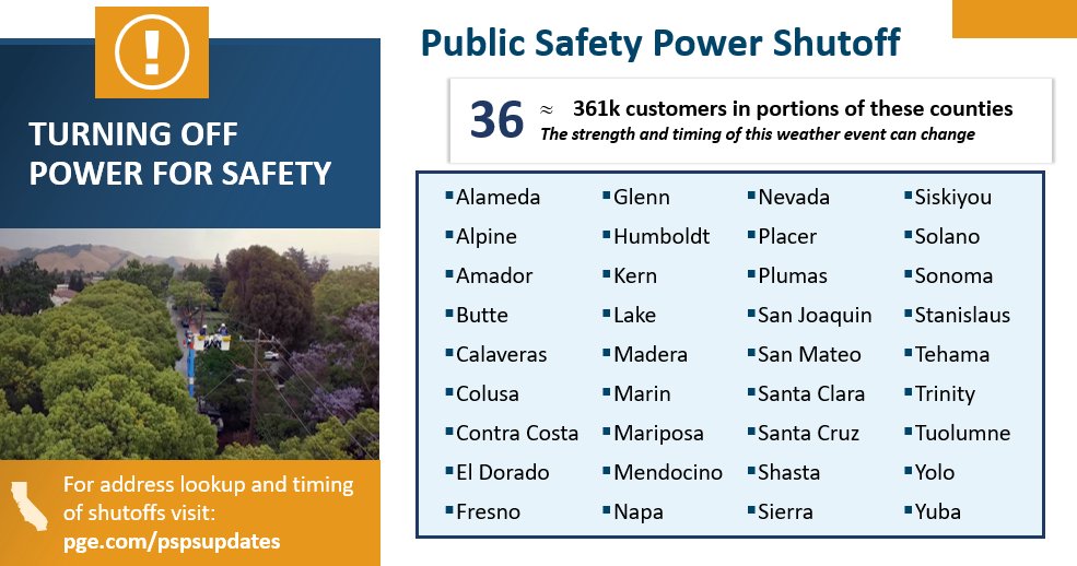 #PSPS: Approx. 87k customers in: Alpine, Amador, Butte, Calaveras, El Dorado, Kern, Lake, Napa, Nevada, Placer, Plumas, Sonoma & Yuba counties have been *removed* from scope for potential Dec. 7 PSPS event due to changes in wind shift & relative humidity http://www.pge.com/pspsupdates .