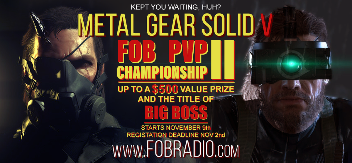 #MetalGearSolid? Want to win $500 in prizes? Got what it takes to claim the title of#BigBoss? Presenting the Second Annual#MGSV FOB PvP Championship! Powered by http://FOBradio.com Register NOW! Deadline Nov. 2nd.#eSports#PVPeSports#Konami#MetalGear#METALGEAR31stpic.twitter.com/FFqFPrD0D3