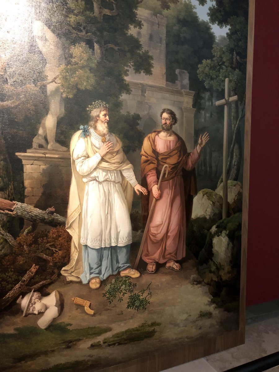 @GregBufithis is currently visiting@BayeuxMuseum which has an exhibition on the triumph of#Christianity over#Paganism - the canvas depicts St Exuperius in debate with a Druid - note branches of oak & mistletoe, broken gold sickle, statue of Mercury on floor pic.twitter.com/KpD1Nysts5