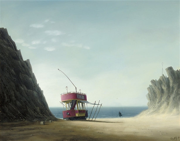 #onthisday1914 Felix Kelly New Zealand realist-surrealist#artist#painter of meticulously executed romantic style featuring recurring motifs red & white striped deckchairs hot air balloons paddle steamers railways trams trains motifs contrasted with a wild untamed landscape pic.twitter.com/na7CXu9eo5