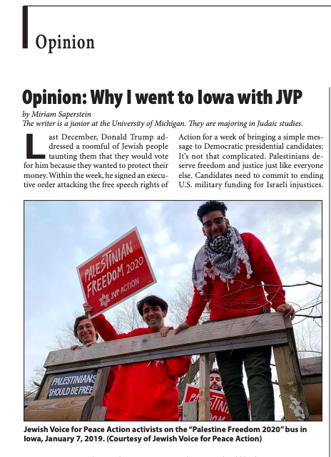 Don't miss JVP Action student leader, Miriam in the Washtenaw Jewish News: "We all deserve a world in which everyone has access to clean water, education, and health care. And Palestinians deserve freedom, just like everybody else."