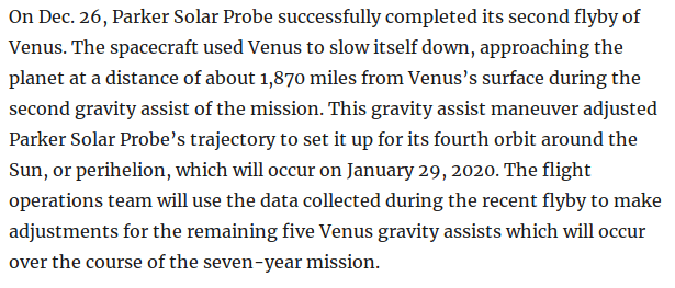 15. Este 26 de diciembre, la completó con éxito su segundo sobrevuelo de Usó Venus para reducir la velocidad, acercándose al planeta a una distancia de aproximadamente 3000 Km de la superficie de Venus durante la segunda asistencia de gravedad de la misión.