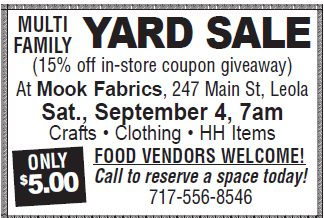 Come by our Leola Mook Fabrics retail outlet THIS SATURDAY for fun, food and savings! Bring in the coupon to get 15% off your purchase.