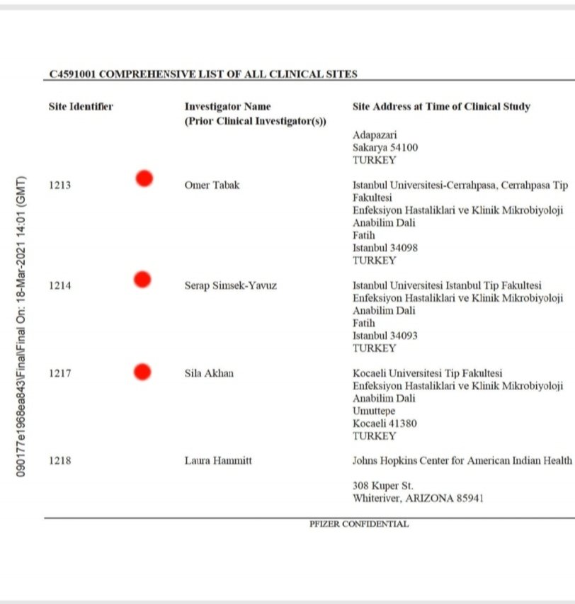 Türkiye'de 9 hastane Pfizerle ortak çalışma yaparak, aşılari gebeler ve çocuklar üzerinde uygulamış ve yanetkileri de raporlanmistir. İfşaasinin 55 yil ertelemesi için bir üst mahkemeye sunan