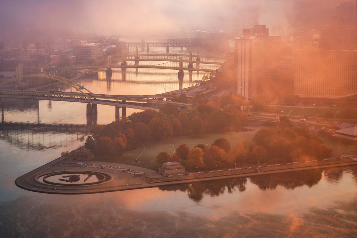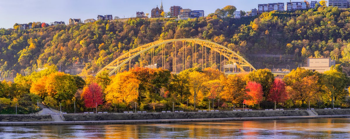 #Pittsburgh, and it looked incredible this morning. With the sun rising above the city into a clear blue sky, the various shades of fall were glowing in Point State Park below the Ft. Pitt Bridge. pic.twitter.com/dZ7zUY3mts