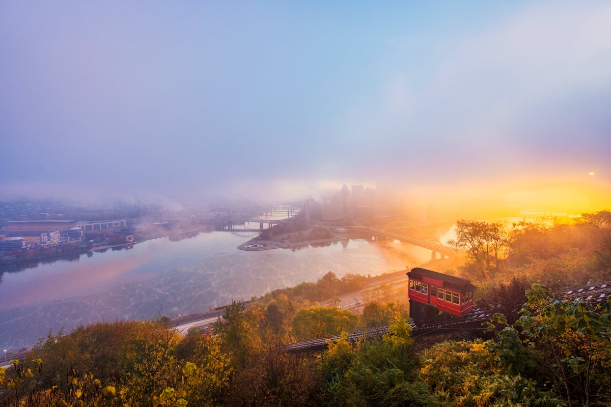 #Pittsburgh was just incredible. It was pretty foggy earlier before clearing before sunrise, and then coming back in full force just after it. When the sun lit up the fog surrounding the incline, it made for an amazing scene, complete with fall colors. pic.twitter.com/II00iGBvD2