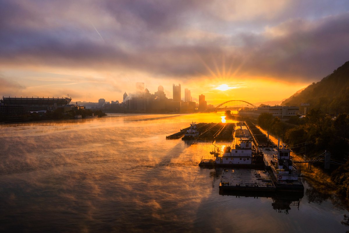 After shooting sunrise from the incline today I headed down the West End Bridge. I got there just in time before the sun went behind the fog to capture this view, with steam on the rivers and long shadows from the boats and downtown