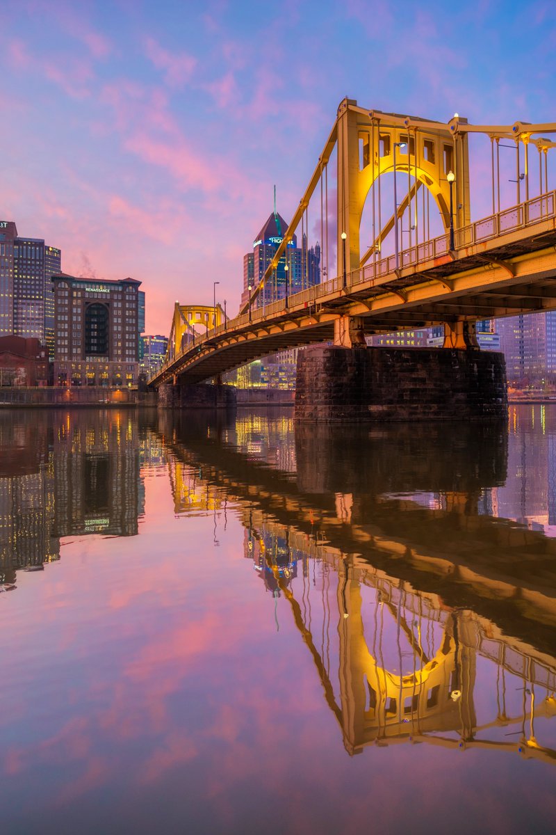 #Pittsburgh. I wasn't sure if we'd see any color or not, but just before sunrise this scene materialized on the banks of the Ohio. A 3 minute exposure helped smooth out the clouds and river. pic.twitter.com/OR0A9dfDAP