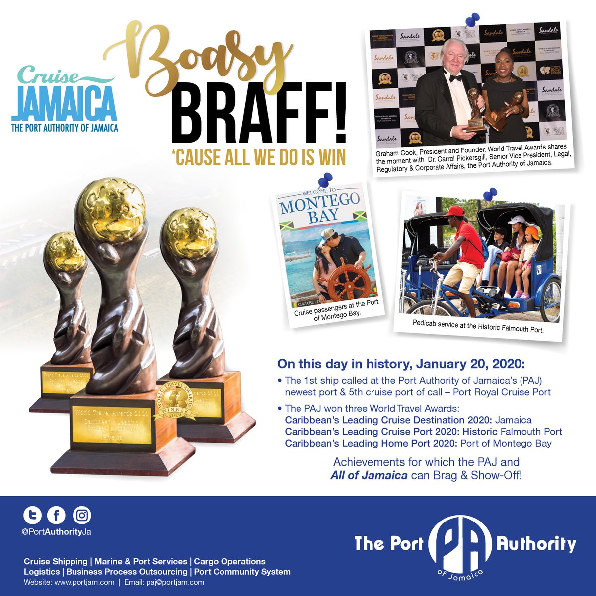 #PortAuthorityJa won three#WorldTravelAwards for: Caribbean’s Leading Cruise Destination - Jamaica Caribbean’s Leading Cruise Port - Historic Falmouth Caribbean’s Leading Home Port - Port of Montego Bay Achievements for which PAJ and all of Jamaica can brag about!