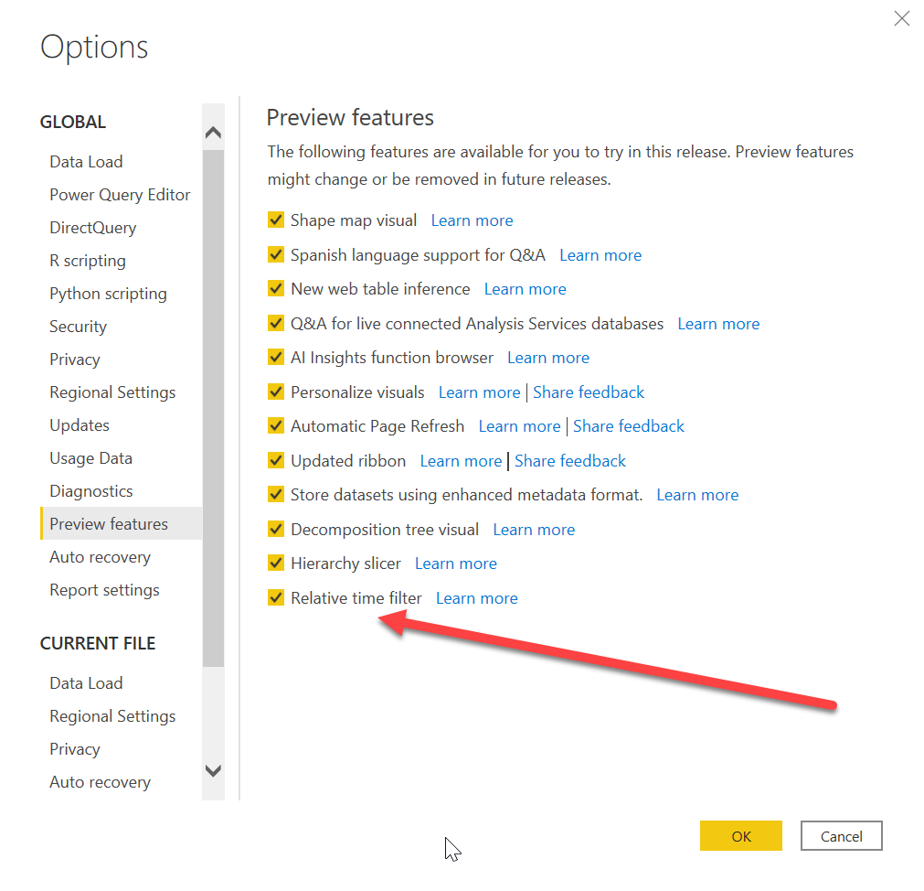 #PowerBI Desktop, nada más abrirlo lo sabrás#PowerBIAdicto, por el nuevo tema de los iconos de Visualizations y en Preview Features el nuevo Relative Time Filter. pic.twitter.com/WIQ68ygCMw