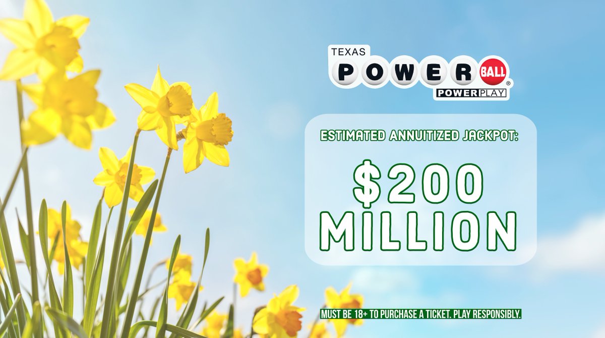 #FirstDayOfSpring! The#Powerball® jackpot has sprung to an estimated $200 MILLION for TONIGHT’S drawing!#Texas#TexasLotterypic.twitter.com/CSDOkhunCh