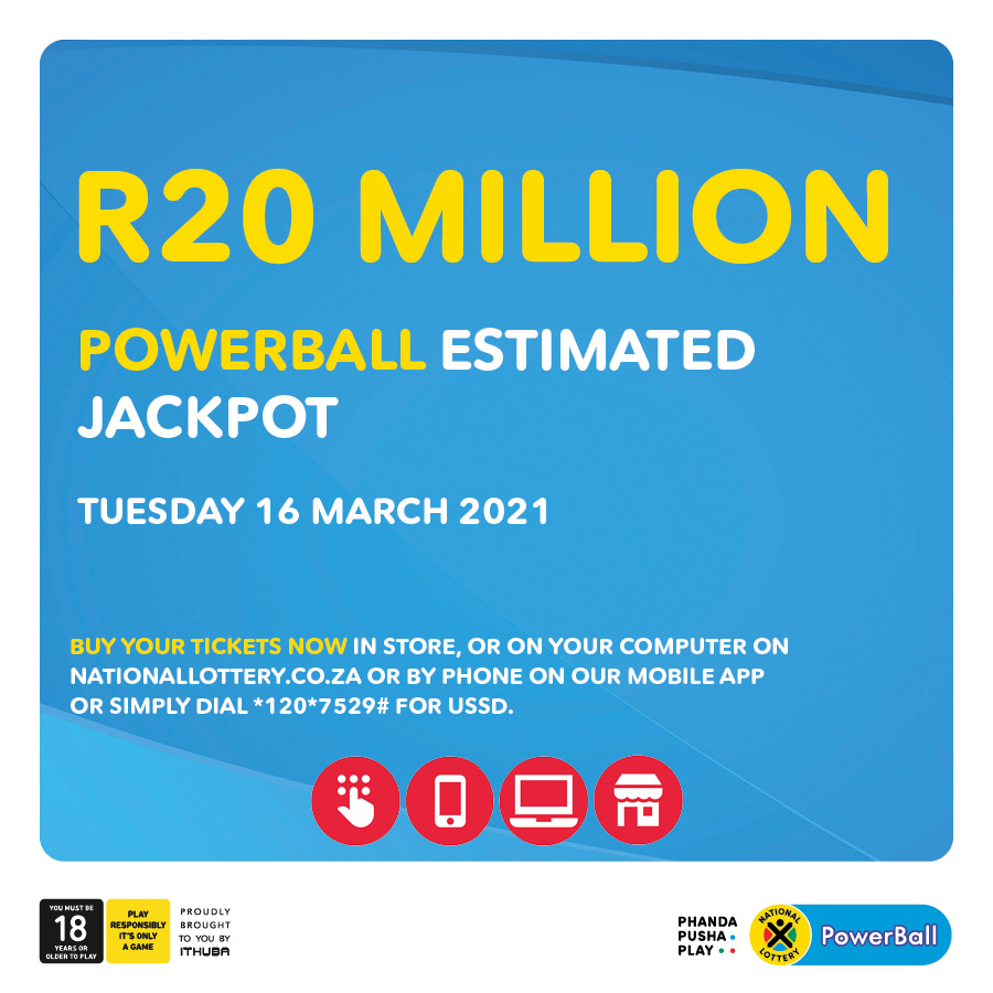 #PowerBall for an estimated R20 MILLION jackpot NOW in store, on your computer at https://lottery-sa.co.za/G , by phone on our Mobile App, cell phone banking or simply dial *120*7529 pic.twitter.com/CH7GW8zt7H